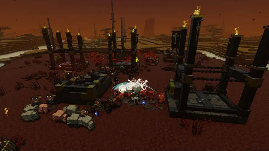 The game begins with the player mining in a cave when they are greeted by three beings: Action, Knowledge, and Foresight. These beings are called Hosts, caretakers of the Overworld. These three persuade the player to help them save their world, where a war has broken out between the Nether and the Overworld. The player is then transported to that world. After completing a tutorial, the player must save a few villages from being invaded by piglins from the Nether. Then, the player destroys three nether outposts that are preparing to invade villages. Subsequently, the player destroys nine Nether portals from three different world areas. In each of these three areas, the player has to defeat a piglin boss: "the Devourer," "the Beast," and "the Unbreakable". Once the player destroys all of the portals and defeats all of the bosses, the player fights the final boss: "the Great Hog." Just as the player defeats the Great Hog, it makes a last attempt at destroying the Well of Fate. This backfires and his army is swallowed by a portal that sends them back to the Nether. Then, the Great Hog finally dies. After the battle, there is a grand celebration in the Overworld of their win over the piglins. Not all is well, however. The warrior villagers, who fought alongside the hero, resent the pacifistic villagers who did not, which causes a rift between the two groups. In addition to this, the Hosts have left the world to the Hero's responsibility and moved on.