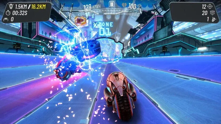 Race through traffic in a futuristic city’s highway with your cyber motorcycle, completing various trials and challenges! Take the city at extreme velocity! Hop your motorcycle and complete various races, time trials and other challenges in a sci-fi metropolis with high-speed! Hit the asphalt hard, zig-zag between bikes and racing cars on vibrant neon lit streets. Hack, boost and maneuver with different futuristic bikes on endless highways! Tune up your vehicle with system updates and hardware upgrades - be the fastest racer in this rapid rush! Improve your racing skills and reflexes, dodge enemy bikes, beat the other racers and try to become the master of the asphalt! Get higher speed and exact handling, use boosts and hacking tactically to leave your foes behind. Compete for the best trial time with other real riders. Discover the glowing, futuristic streets, find every boost, beat every boss and collect as many coins as you can to upgrade your vehicle reaching extreme high speed! Unlock new vehicles, customize your bikes, make them faster, harder, stronger! 32Secs takes you on a real futuristic high-speed experience. Rush and take your best chance to overcome your racing opponents but be careful and don’t crash your bike into cars or any obstacles on the asphalt!